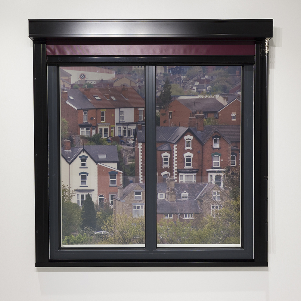The fabric is mounted on a sprung 57mm aluminium barrel, and fitted at the other end with an aluminium bottom rail attached to two draw tapes which are, in turn, attached between flanged guides to the 53mm drive barrel.
